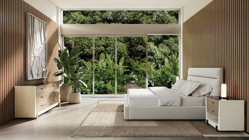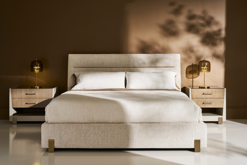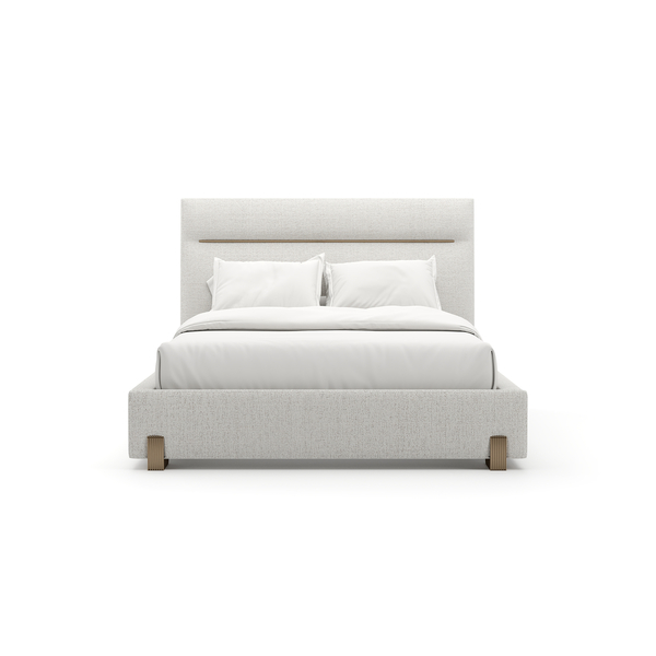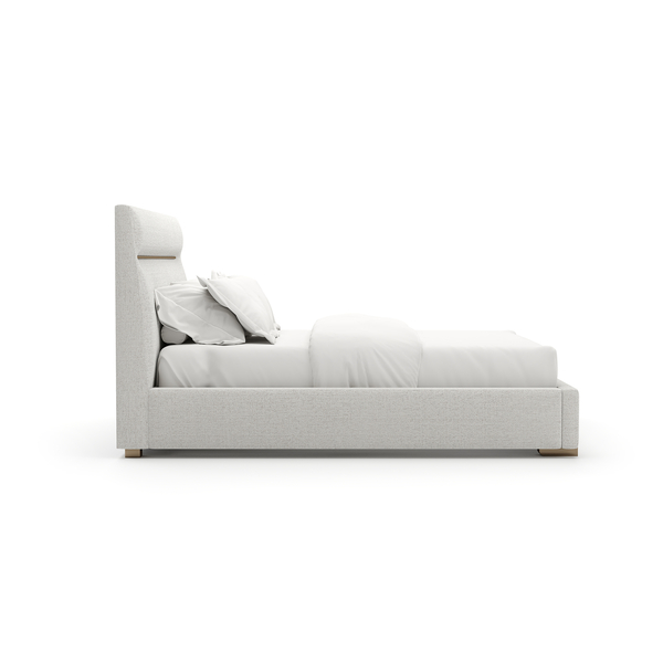 Discover serene luxury with the Counter Balance King Bed. Its sumptuous upholstery in oatmeal melange woven fabric with subtle rust threading and striking Brushed Gold metal feet promise a restful sanctuary wrapped in refined comfort.
