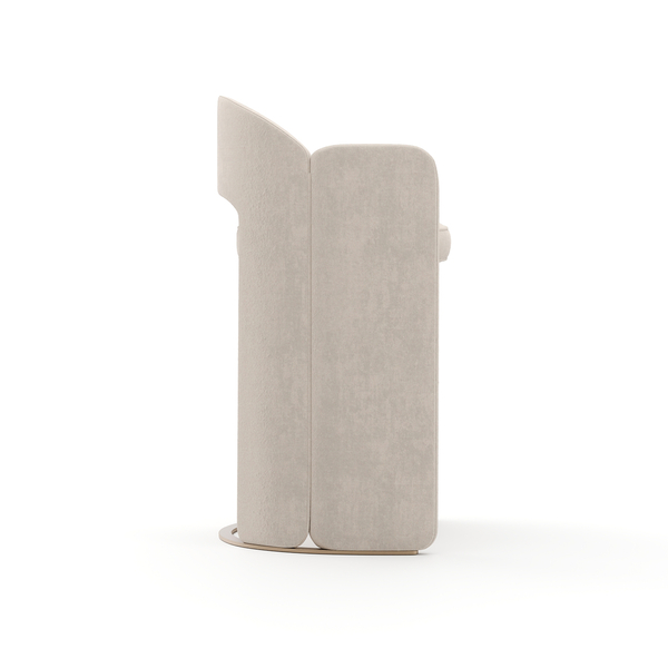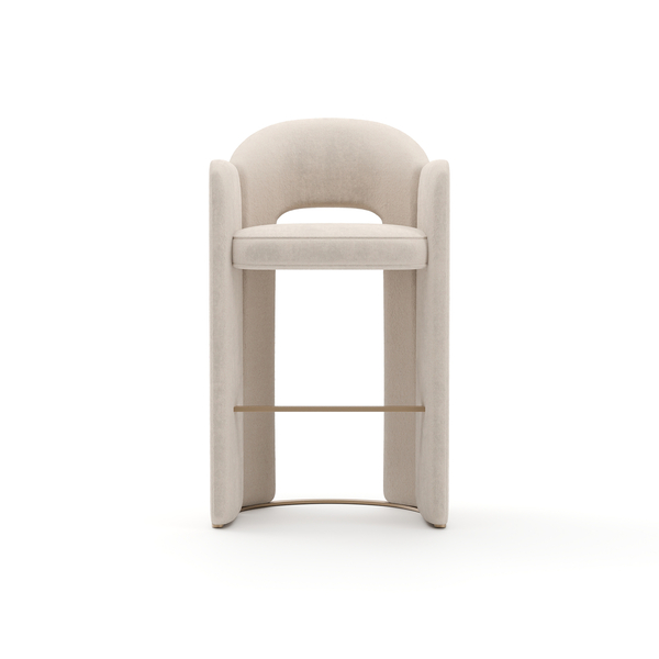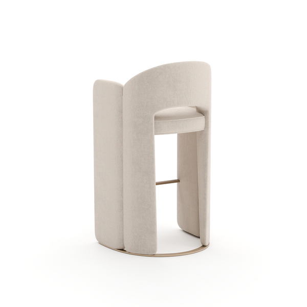 The Overlap Bar Stool Ivory, with its luxurious full upholstery in ivory vintage velvet and delicate metal spline detailing in Whisper of Gold, effortlessly combines comfort and elevated style, ideal for upscale entertaining spaces.