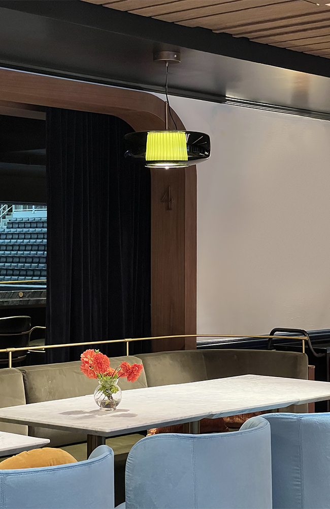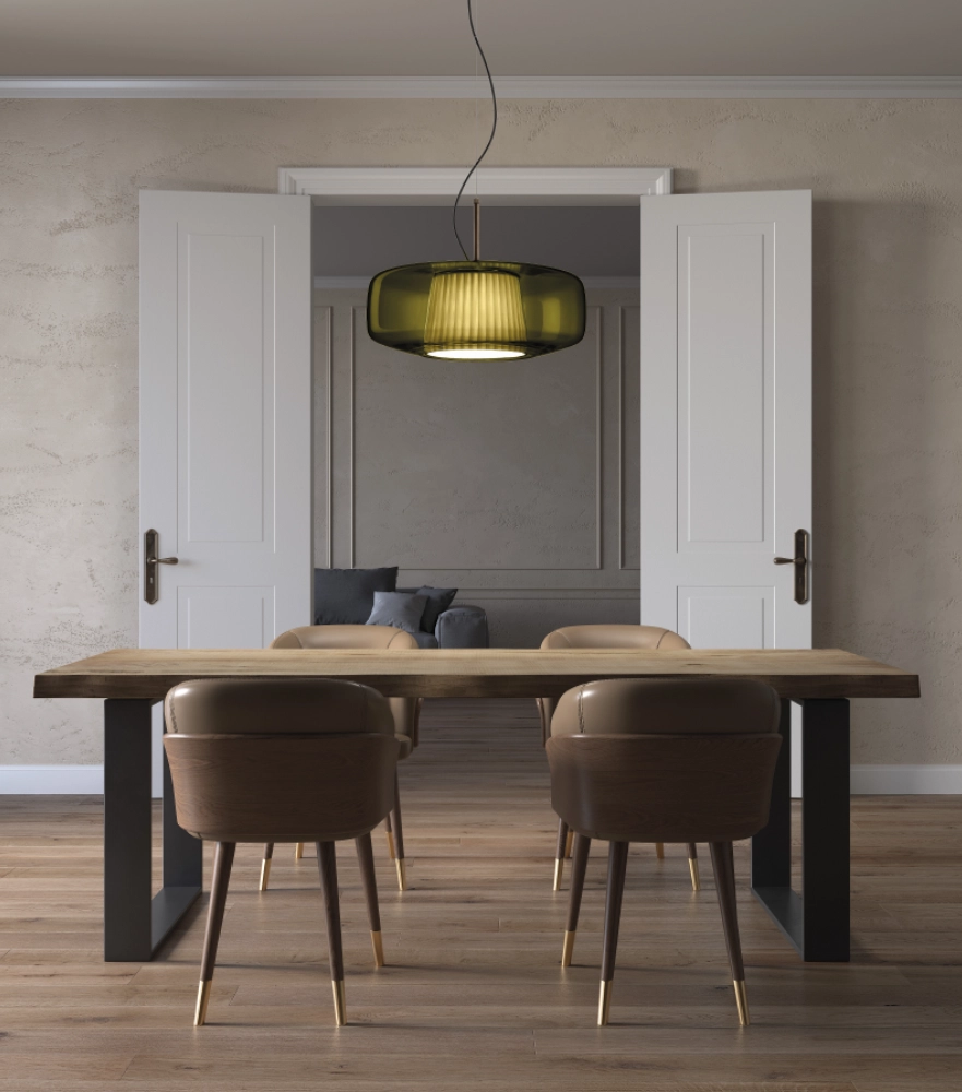 Plissé is a collection with a timeless charm. The blown glass diffuser conceals a delicate fabric lampshade. Available in five glass finishes, four fabric colors, and two metal frame finishes. Available in suspension, in three sizes, and wall types. Integrated LED light source.