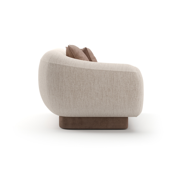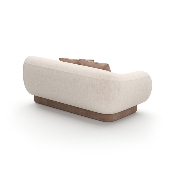 Sink into elegance with the Seta RAF Loveseat, draped in soft oatmeal ribbed linen fabric and camel faux mohair base. Its subtle sophistication and inviting form create an atmosphere of peaceful indulgence.