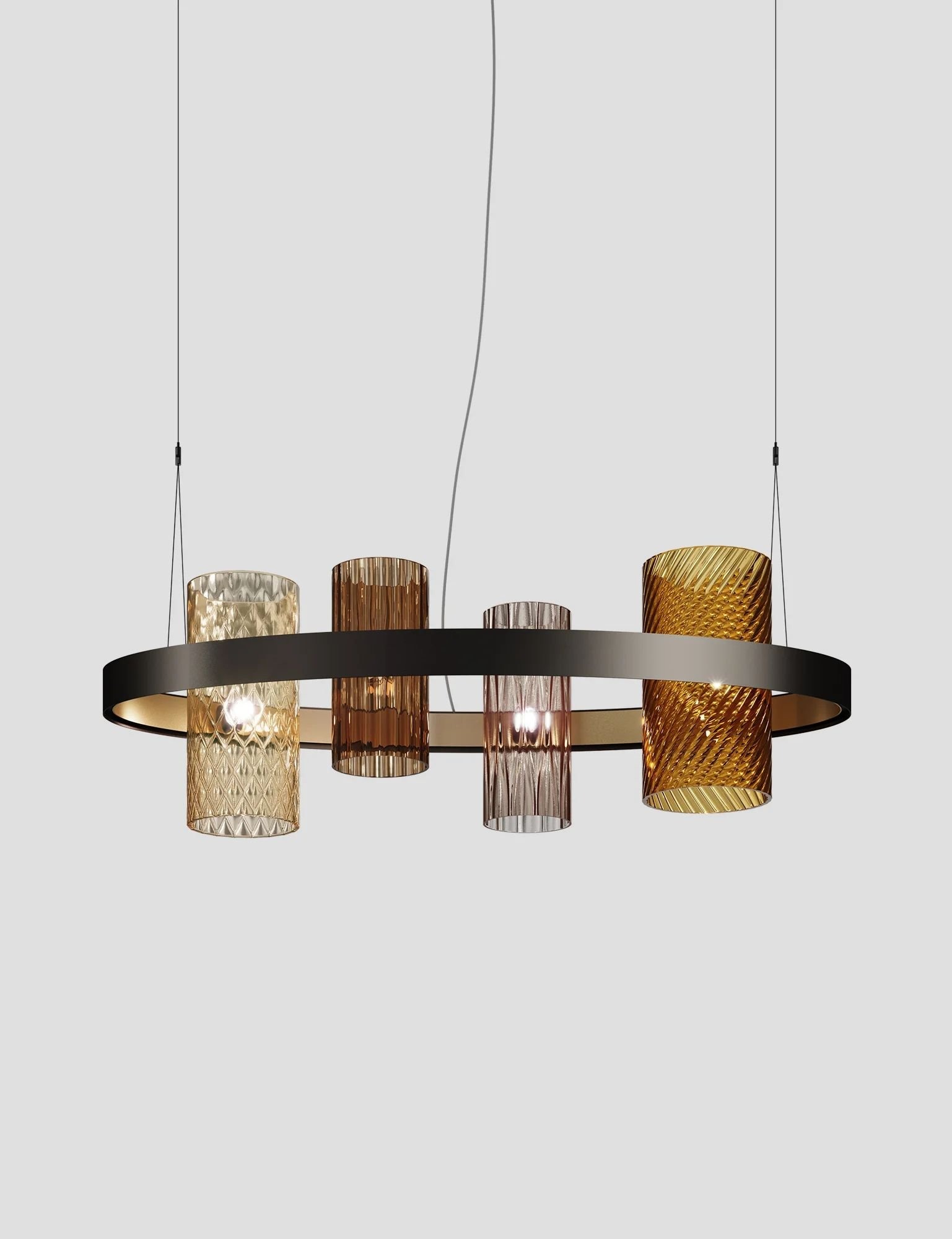 A collection with contemporary connotations that incorporates precious historical features: those of glass working such as the “balloton” and the straight and twisted “rigadin”. The collection is completed by a large new suspension in which the oval frame supports four colored and textured cylinders in pure crystal and four new wall versions.