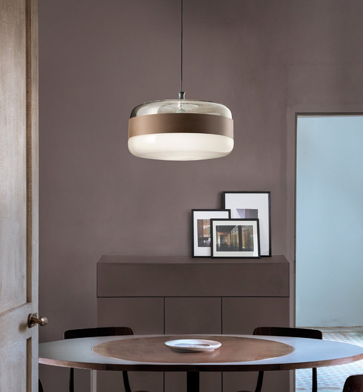 A collection of lamps made from a single piece of blown glass, whose particular workmanship, though, allows a double chromatic effect: transparent at the top, satin effect at the bottom. The following combinations of glass with metal ring are now available: white glass combined with matt black ring, smoky glass with brown ring, amber glass with painted brass ring. A new transparent crystal glass finish with copper or matt black ring.