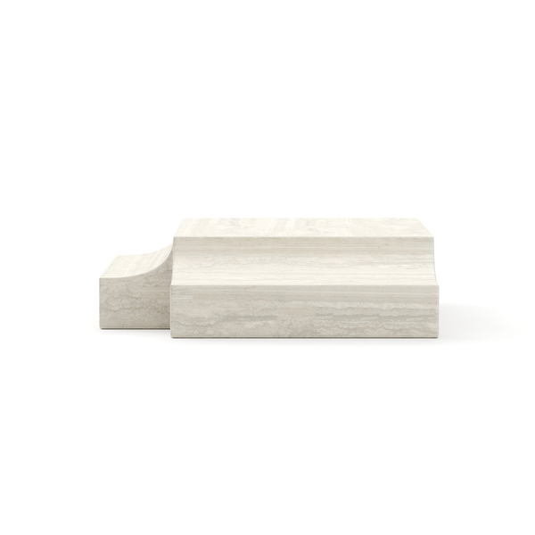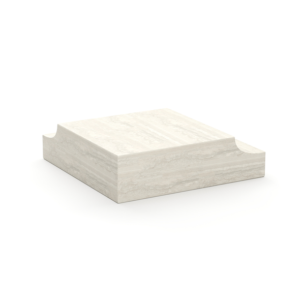 The Corner Wedge Base in unfilled Travertine stone offers a distinctive blend of style and versatility. Its expressive Whisper of Gold accents illuminate your dTcor, creating an alluring intersection of luxury and contemporary design.