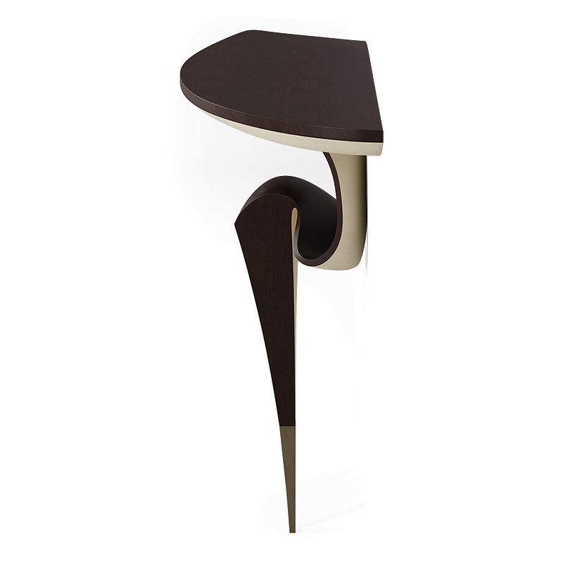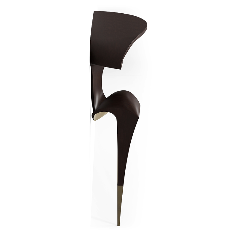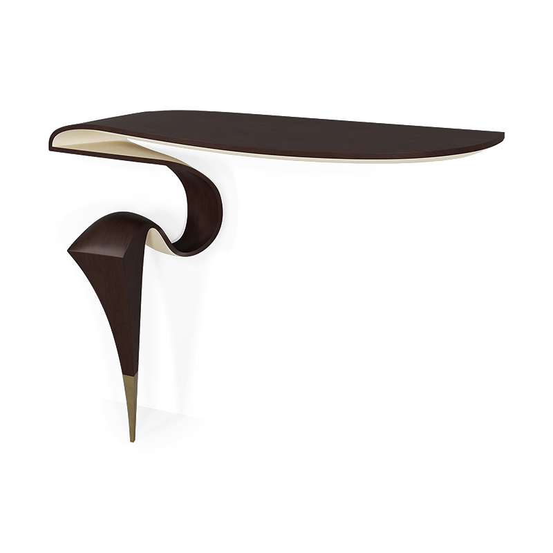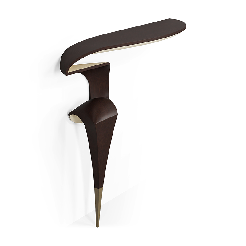 Striking and poised, the Pelican console table channels the elegant stillness of its namesake with a hand-carved mahogany base and a floating, wall-mounted top. Choose from a leather-lined or fully finished interior, accented by aged brass or brushed nickel leg tips—each variation a modern statement of craftsmanship and sculptural elegance.