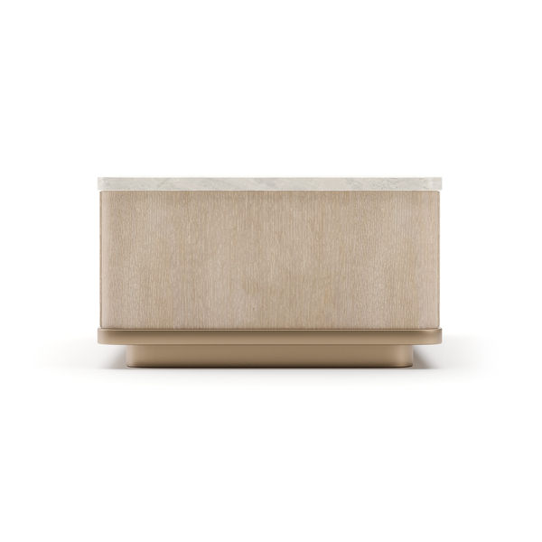 The Rhythm Rectangle Cocktail Table showcases a luxurious Travertine stone top, enhanced by Sun Drenched Oak finishes and reeded doors. Supported by a refined Neutral Metallic base, this table elegantly combines organic beauty with sophisticated craftsmanship.