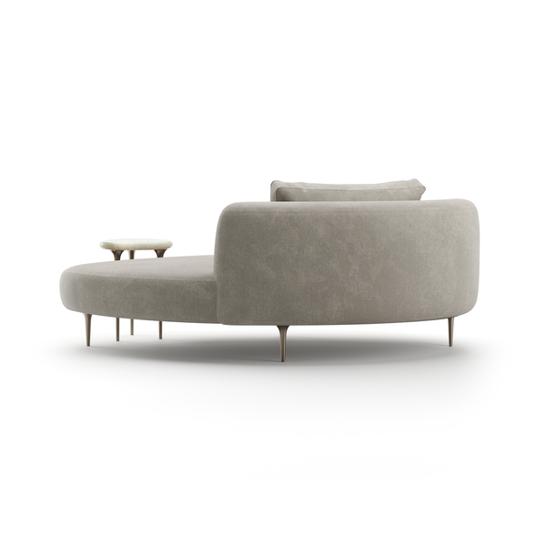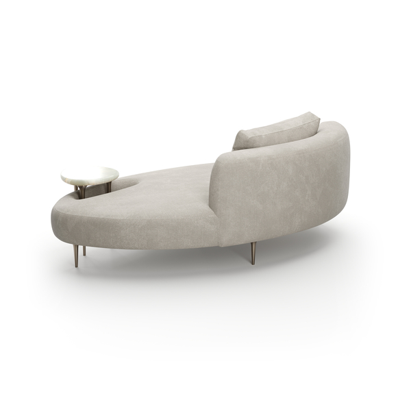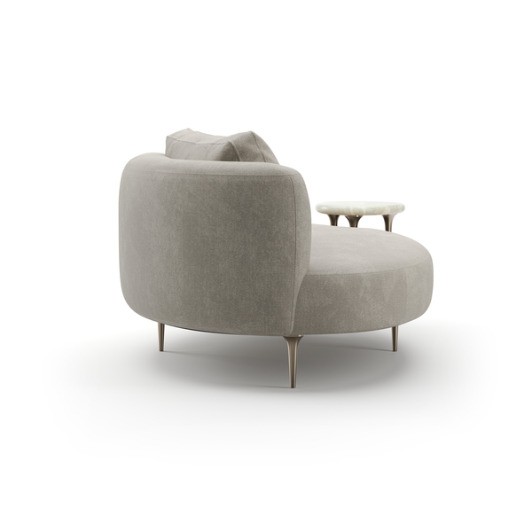 The Echo Lounge combines plush upholstery in pale grey mohair with Champagne Gold metal legs and table supports. Its integrated accent table crafted from luxurious Gray Onyx stone provides sophisticated functionality, making it an exquisite addition to your living area.