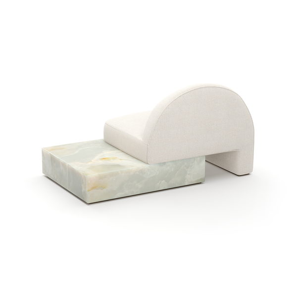 The Monaco Lounge embodies sophistication, featuring sumptuous upholstery in ecru linen set on a striking Green Onyx marble base. Detailed with exposed wood in Lucent Bronze Metallic paint and a convenient drawer, this lounge brings functional luxury to your space.