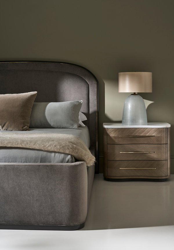Immerse yourself in refined comfort with the Wanderlust King Bed Dark. Rich Seal Skin wood detailing and Whisper of Gold trim highlight its beautifully upholstered headboard, footboard, and siderails in pewter heathered velvet, offering a restful haven of style and serenity.