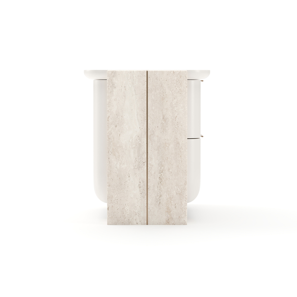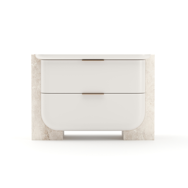 Crafted for refined tastes, the Overlap Large Nightstand Light elegantly merges contemporary luxury with natural beauty. Featuring a gentle Latte finish paired with distinctive unfilled Travertine stone side panels, it's gracefully detailed with metal trim in Whisper of Gold. Two spacious drawers, each with interiors matching the Almond Milk exterior, create practical elegance, making it an effortlessly chic addition to your decor.