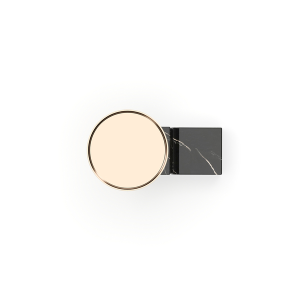 A statement of minimalist luxury, the Overlap Nightstand Base Dark captivates with a stunning Nero Marquina stone base, each piece uniquely patterned by nature. Topped by an elegant metal tray in luminous Whisper of Gold, it provides a sleek platform for essentials or decorative items, gracefully harmonizing bold stone texture with sophisticated metallic accents.
