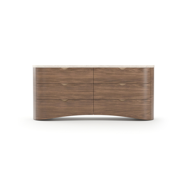 Elevate your bedroom with the sophisticated Fleur Dresser. Crafted with an exquisite, unfilled Travertine stone top, each dresser offers unique natural beauty marked by variations in color, veining, and subtle detailing. Its refined Porcini-finished case complements any decor style, while six spacious drawers featuring UV Snow interiors ensure practical elegance. Accented with striking brushed gold metal hardware, this dresser exudes refined charm and luxurious style. A statement piece, combining natural allure with exceptional functionality.